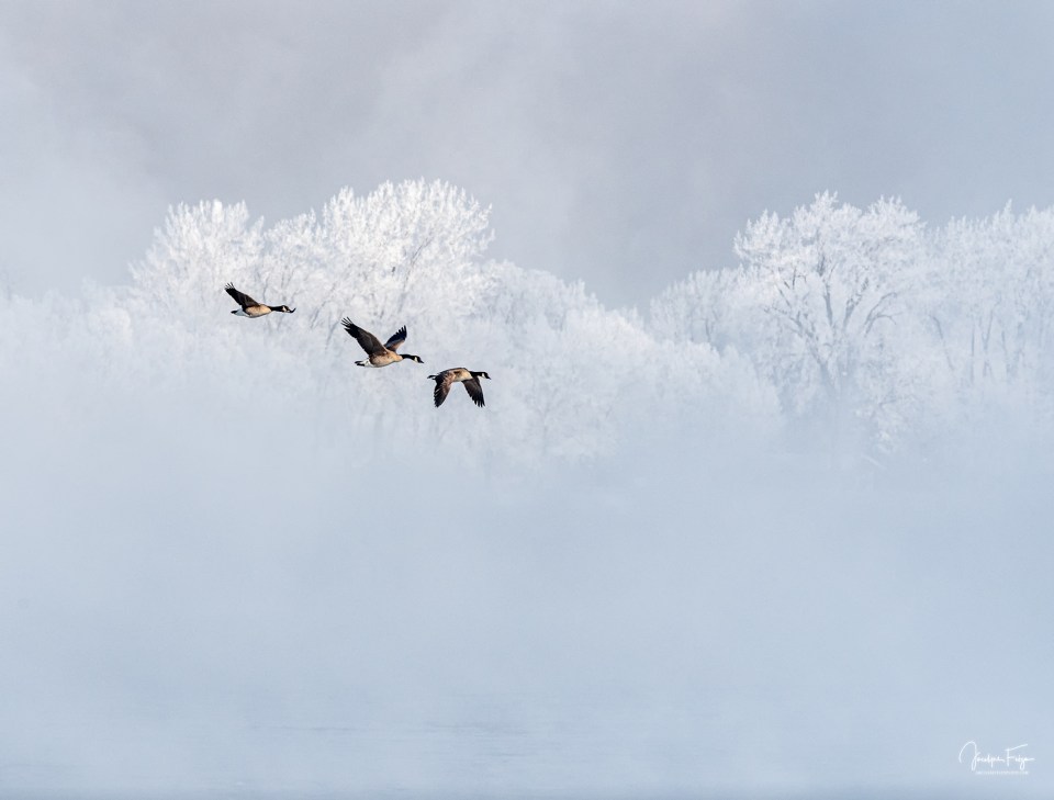 Bernaches du Canada sur fond de givre
